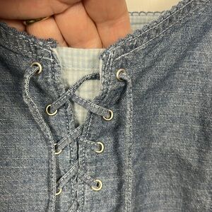 Faded Glory Womens Mini Sundress 10 Blue Chambray Lattice Tie Front Zip Back EUC