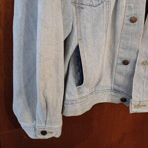 Blue denim Faded Glory brand jacket. Has two outer pockets that button, two outer pockets that don't button, two deep inside pockets that don't button, buttons and straps to adjust the back, and one button on each sleeve.