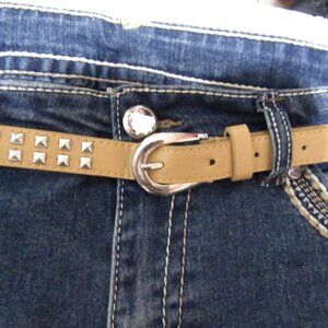 Belt is color beige 1 in wide. 5 pocket style. Measures taken lying flat