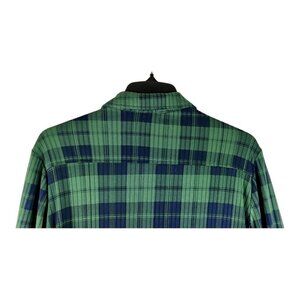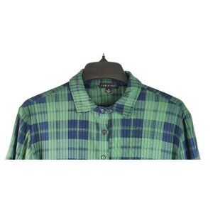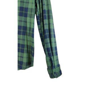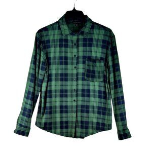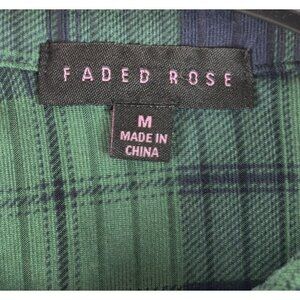 Women's plaid shirt by Faded Rose. Very soft, knit material in a green and navy plaid. One front pocket. Button up front, one pocket on the left side. Rounded hem, front and back, that curves up at the sides. Excellent condition.