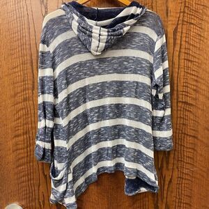 Like new Faded Glory academia professor teacher navy and white cardigan sweater 2 pack. EUC, great shape, size XXL, cotton polyester blend. 1- navy and white striped open front 3/4 sleeve hoodie cardigan. 2- white fitted v neck button front cardigan. See pictures for details.