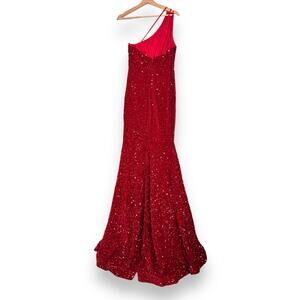 Faeriesty Red Sequin Velour Floor Length Mermaid One Shoulder Gown Women's M/L