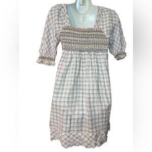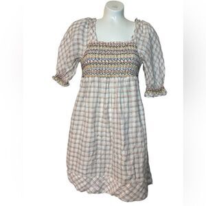 Faherty 100% Linen Lola Windowpane Smocked Puff Sleeve Mini Dress