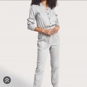 This gray "stone" colored jumpsuit by Faherty features a sleek, minimalist design with a flowy fabric that drapes beautifully. Its versatile style is perfect for both casual and dressier occasions, making it a must-have addition to any wardrobe. Basically new without tags - I think I only tried it on. Perfect condition.