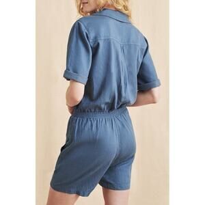 Put a play date on the calendar so you can wear this romper made from a lightweight fabric featuring soft, sustainable Tencel® lyocell, cotton and linen. Front button closure Notched lapels Short sleeves Elastic waist Chest patch pocket; front slant pockets 49% Tencel® lyocell, 21% cotton, 28% linen, 2% elastane