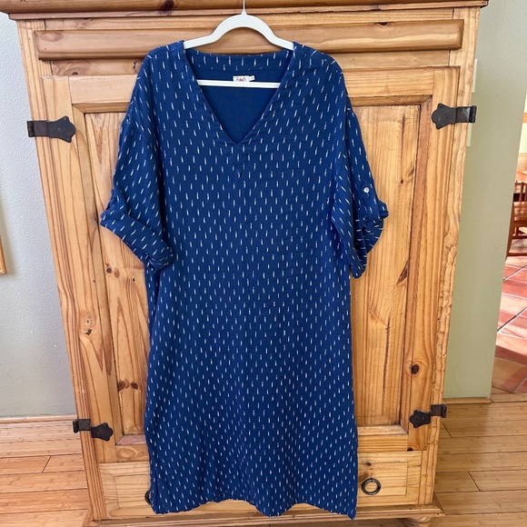 Women's Faherty Atlantic Ave Dress, v neck, blue shadow, button detail on sleeves, 100% organic cotton, no belt, size large