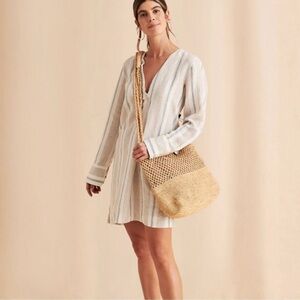 ** Beach, Linen, Resort-wear, cruise, vacation, lake, natural fibers, lightweight, pool, swim cover, oversized, cottagecore, western, grandmacore, feminine, spring, summer, Coquette, striped, blue, tan, cream, white,