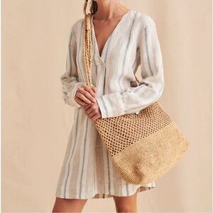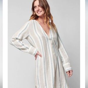 Faherty Beach Days Tunic/Striped Blue White/ V-neck/Long Sleeve/100% Linen/NWOT