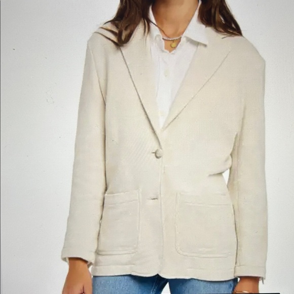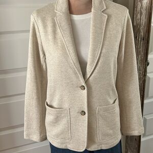 Faherty Blazer. Size S. Light Oatmeal. Knit blazer. 2 button front. 2 large exterior pockets. 2 Internal pockets. Slightly oversized. Perfect for spring summer into fall. Purchased from Nordstrom. NWOTs. Advertising NWTs because I never wore. Stored in white garment bag. Just too big on me. Excellent condition.