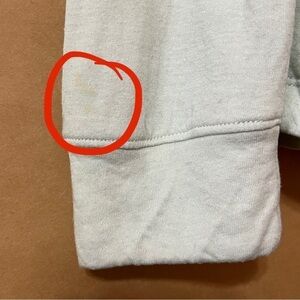 Good preowned condition; has a hole on top layer of neckline, some spots on back sleeve near cuff, and some wash-wear throughout!! See all photos!!