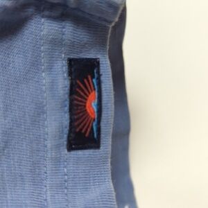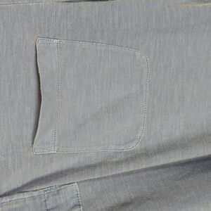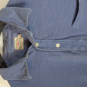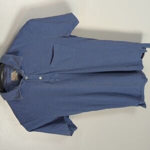 Faded blue. Fold over collar. Three button neckline. Short sleeves. Some fading and washwear (may be manufactured this way, I can't tell), but no stains, holes, or fraying. Laid flat pit-to-pit: 18in. Shoulder to hem: 25.5in.