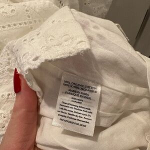 This Faherty blouse showcases a relaxed silhouette with elegant puff sleeves and a unique bib collar, crafted in a soft cream fabric. The short sleeves and button-down design offer a versatile style, ideal for both casual and dressy settings.