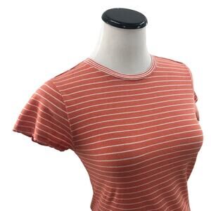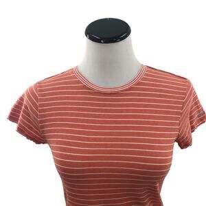 Brando's got nothing on this retro fit, 50s style tee. Light, easy to wear and in our favorite spring colors, this short sleeve matches any sunny day. Color is coral. Wave detail embroidered on one sleeve. Cotton, linen, polyester. Machine wash. In preowned condition, some minor fabric wear. WKS1924.
