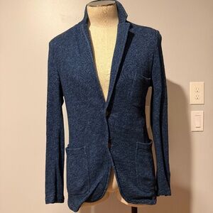 Detail: Fully knit sweater construction. Fashioning at armholes. Rib stitch at collar, cuffs, and hem.