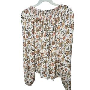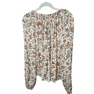 Elegant floral blouse with tie-neck detail. Soft cream and brown tones. Perfect for casual or dressy occasions.