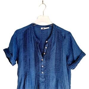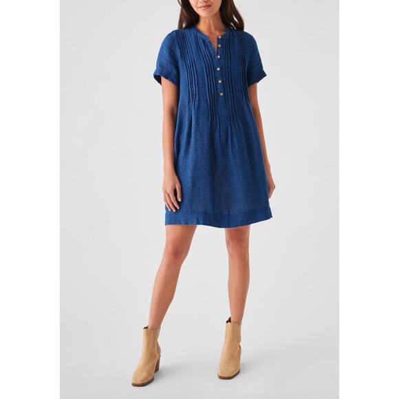 Faherty Gemina Linen Dress Pintuck Indigo Blue Short Sleeves Women Size Small