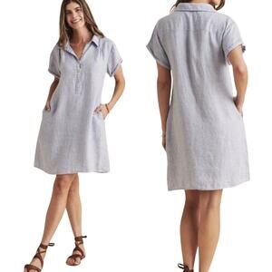 Faherty Linen Dress Button Up Neckline Cuffed Short Sleeve Mini Blue White