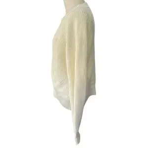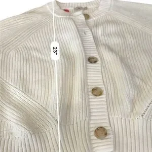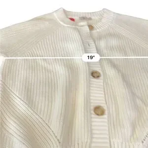 Soft ribbed knit cardigan with large buttons. Crew neckline and relaxed fit. Neutral ivory color for versatile wear. Easy to layer over tees or dresses.