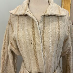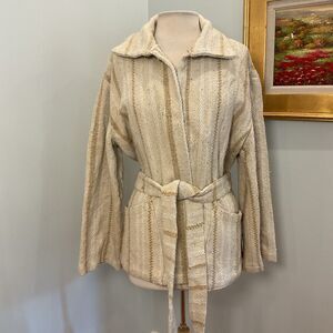 π Features: Belted waist, open front, side pockets, textured woven fabric, relaxed fit, sustainable craftsmanship