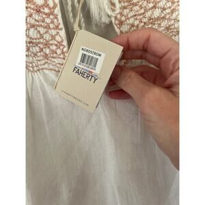 Please see photos of imperfection. Front has areal with slight shifting of the cotton, Keep in mind that this is gauzy cotton so it is not as tightly woven. Back has area with discoloration and also black spot on upper back