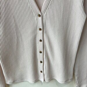 Features: v neck, button closure front, long fitted sleeve, waffle knit fabric