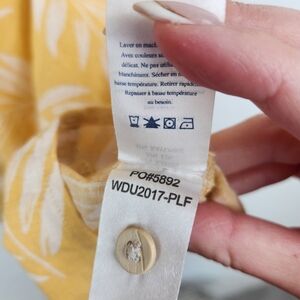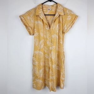 Faherty Linen Blend Yellow Shirt Dress Size Small. Stylish yellow dress with a leaf pattern. Features short sleeves and a button-up front. Perfect for casual outings. Pre owned in good condition. Minor wear showing. Pockets. Measurements are in the photos. Mini length. above the knee.
