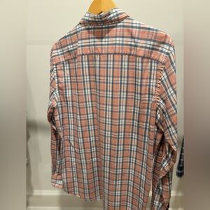 Casual button-down with coral and navy plaid. Ideal for relaxed outings.