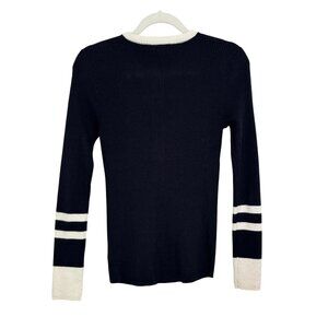 Faherty sweater, Faherty henley, navy henley top, Faherty ribbed knit, Faherty women’s sweater, nautical sweater, striped sleeve sweater, Faherty long sleeve top, coastal style sweater, preppy henley, Faherty size small, WYC0006-CLC, Faherty navy cream sweater