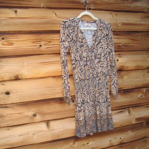 A batik print enlivens this split-neck dress designed with a smocked waist and a swingy skirt.