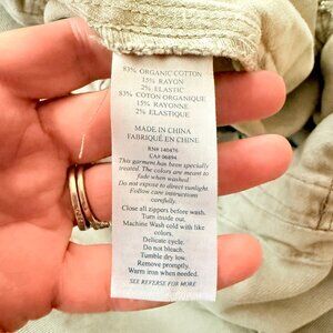 Organic cotton with some stretch. Zipper front with snap button closures; can cinch waist with ties located inside. Pleases refer to photos. Nice and sturdy fabric with a heavy thickness to it.
