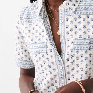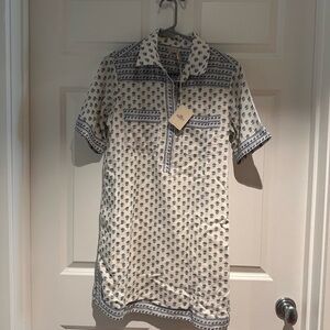 Chic short-sleeve dress with a blue and white pattern. Features a relaxed fit and a stylish neckline. Perfect for casual outings. NWT