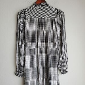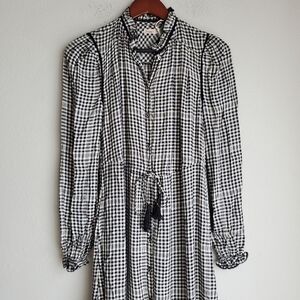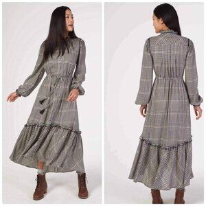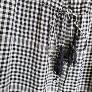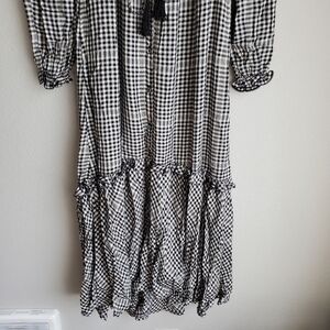 This buffalo checkered print dress features a button-down closure, a tie waist for a flattering fit, and is finished with ruffle sleeves. Ladder trim and picot details for a touch of romantic allure