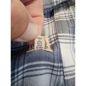 Brand: Faherty Brand Item: Mens long sleeve button front shirt with a soft brushed flannel feel and classic plaid pattern. Color: Blue and white plaid. Size on tag: Large. Materials (per tag): 48% Supima cotton, 48% ECOVERO viscose, 4% elastane. Made in Vietnam. Style/Model information: STYLE# MWF2309, PO# 32034, RN# 140476, CA# 64607. Details: Single chest pocket, button cuffs, curved hem, small Faherty sunrise logo tab at side seam, spare buttons attached to interior care tag. “Pre-owned with light overall wear from gentle use. No holes, stains, or major fabric flaws observed. Buttons, seams, and cuffs all appear intact.”