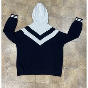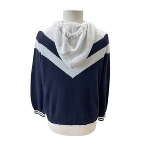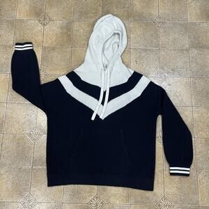The Faherty Throwback Sweater Hoodie is a stylish and versatile pullover hoodie designed for women in size Large. Made from a luxurious blend of organic cotton and cashmere, this hoodie features a classic striped pattern in black and white, with long sleeves and a hood for added coziness. The drawstring accents add a personalized touch to this knit hoodie, suitable for various occasions from casual outings to activewear and travel. Ideal for all seasons, this hoodie offers a comfortable fit for women looking for a blend of style and functionality in their wardrobe.