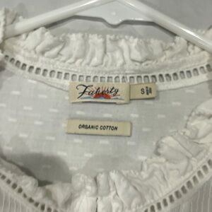 Elegant white blouse with ruffled neckline. Features a subtle ribbed pattern.