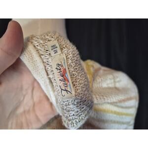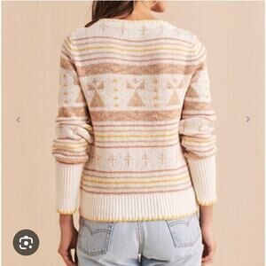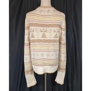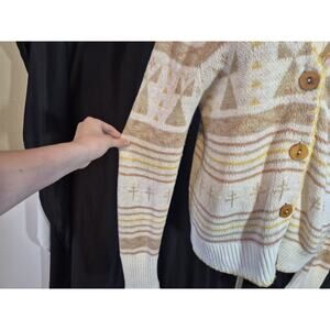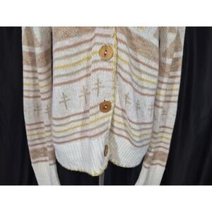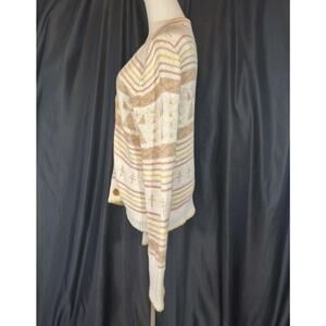 The Faherty Women's Yellowtail Dragon Fly Path B Homeland Cardigan Sweater in size Medium is a stylish and unique addition to any woman's wardrobe. This multicolor sweater features a geometric pattern, long sleeves, and a V-neckline, making it a versatile and fashionable piece. Made from a blend of linen and cotton, this knit sweater is oversized and has a button accent, adding a touch of detail to the tunic style design. Perfect for adding a pop of color and style to any outfit, this sweater from the brand Faherty is sure to make a statement.