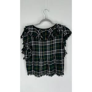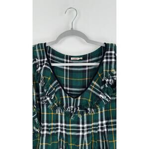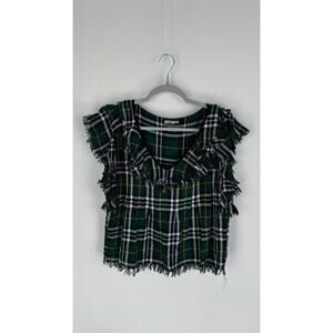 Faherty Yosepha Ivy Womens Green Plaid Blouse Short Sleeve Fringe Size Large