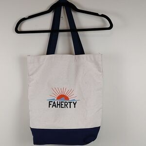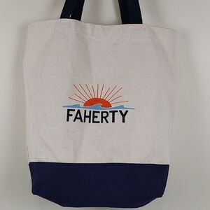 Faherty Canvas Shopping Tote Bag in natural canvas and navy blue. Faherty sunrise and wave logos are on both sides of the bag. The straps and bottom are navy blue. This is a great bag for everyday use!