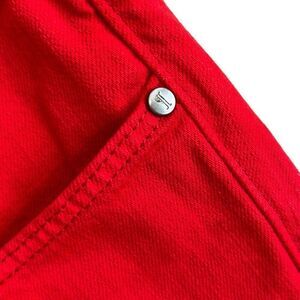 Radiant energy in motion. These red skinny jeans offer a vibrant splash of color to invigorate your wardrobe. Boasting a sleek silhouette that hugs your curves without compromising on comfort, these jeans feature classic five-pocket styling, with a subtle yet stylish metallic detail on the front pocket. These timeless skinnies will seamlessly transition from day to night. Imagine yourself wearing these while enjoying brunch with friends, going out for a casual date, or running errands around town.