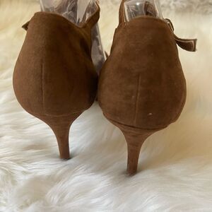 Fahrenheit brown faux suede ankle strap sandals peep toe size8.5 pre owned in good used condition clean no tear normal wear see all pictures any questions please message