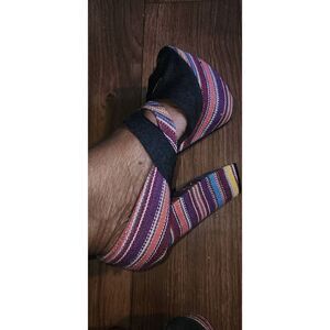 Uniquely beautiful black drnom cut-out and multi colored fabric peep toe platform chunky heel slip on shoes size 10 platform apx 2" heel 6"