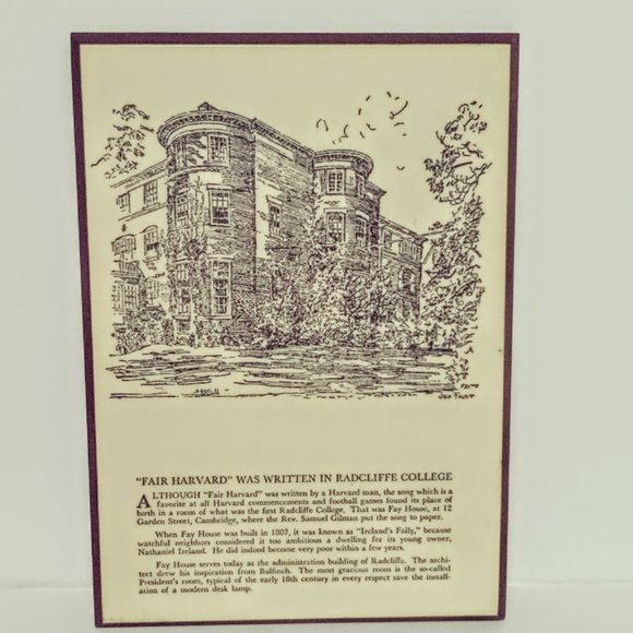 Fair Harvard Was Written in Radcliffe College Ceramic Wall Plaque with cork backing by Jack Frost. Please checkout the pictures for descriptions and conditions. So you can make a decision on what you will be receiving and Thanks for stopping by!