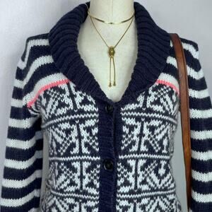 Fair Isle Knit Cardigan Nordic Fisherman Sweater Chunky Knit Size Medium. Navy, White, and Pink. Lamb’s Wool / Nylon Blend, Gap Brand