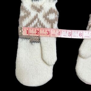 Fair Isle Pattern Cream white, tan and grey extended length knitted mittens size M/L longer than average size so they have elastic at the wrist to keep you covered in the cold. Not sure if fabric content but I’m guessing they are a Lambswool polyester blend - super soft and cuddly.