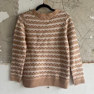 Buttery soft sweater that feels like a hug. Neutral beige and cream fair isle style knit with ribbed crewneck, cuffs, and hem. Made with a plush acrylic nylon blend that’s lighter than wool but just as warm. Perfect layered with denim, tossed over leggings, or styled with a crisp white shirt underneath.