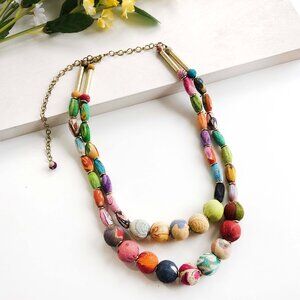 Fair Trade NWT 2 Strand Boho Necklace Handmade Upcycled Kantha Fabric Recycled