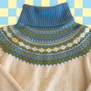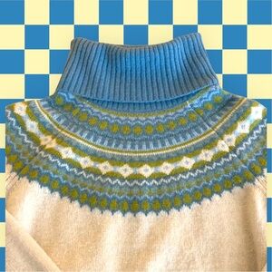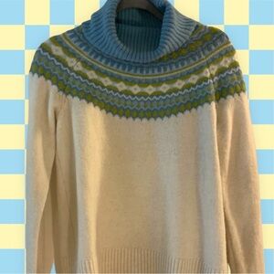 Fair isle sweater Merino Wool Blend chartreuse Blue Winter white size Small