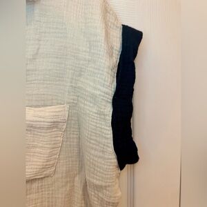 Breezy, fresh button up with a neutral color blocked palette. Chest pocket and frayed hem. Folded sleeve detail. 100% cotton with a gauze weave.