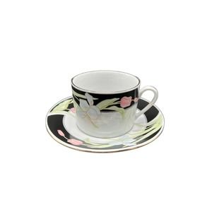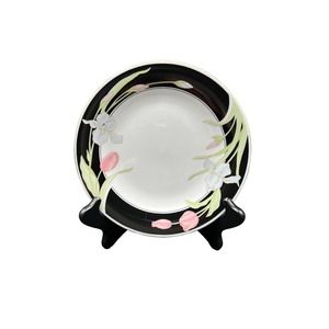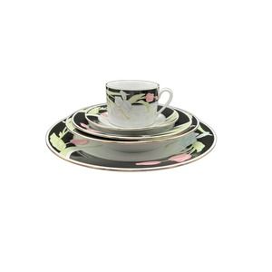 This set comes with a dinner plate, a dessert plate, a coup bowl, a saucer, and a flat coffee cup. The pattern features blue irises and pink tulips against a black a band. There is also a 24K gold accent around the rim or each piece. This is as retro as it comes.