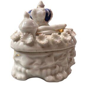 This vintage porcelain box combines elegance and functionality, featuring intricate floral details and a striking blue accent on its ornate lid.